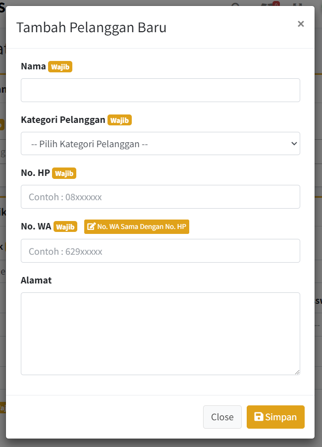 1. Tambah Data Pelanggan, jika pelanggan tersebut baru. Klik tombol tambah baru dan isi form pelanggan baru.