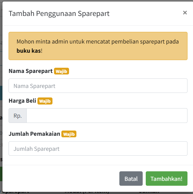 6. Jika sebelumnya kamu sudah masukkan data stok sparepart, maka pilih dari Stok. Jika belum, klik Luar Stok dan isi sesuai form yang tampil